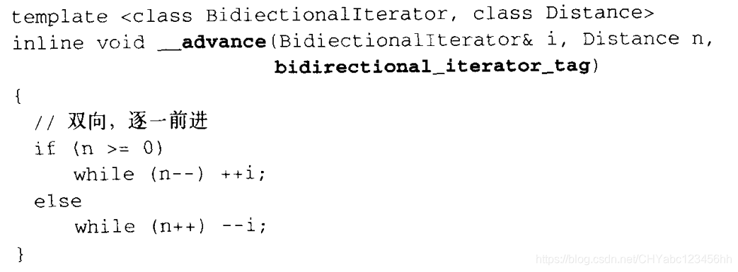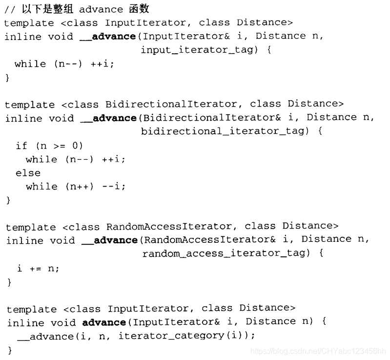 - 拿 advance () 来 说 (这是许多算法内部常用的一个函数),该函数有两个 参数,迭代器P 和数值n;函数内部将p 累进n 次 (前进n 距离)。下面有三份定义,一份针对 Input Iterator, 一份针对 Bidirectional Iterator,另一份针对 Random Access Iteratoro倒是没有针对Foiv/ardlterator而设计的版本,因为那和 针 对 Inputiterator而设计的版本完全~致。