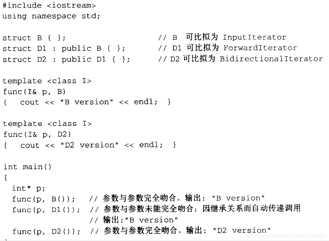 - 以 class来定义迭代器的各种分类标签,不仅可以促成重载机制的成功运作 (使编译器得以正确执行重载决议,overloaded resolution), 另一个好处是,通过继承,我们 可 以 不 必 再 写 “单纯只做传递调用”的函数(例如前述的 advance() Forwarditerator版 ) 。为什么能够如此?考虑下面这个小例子,从其输出结果可以 看出端倪: