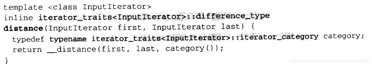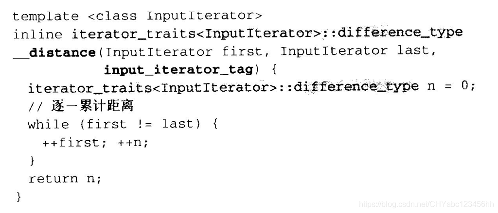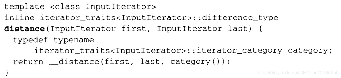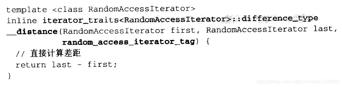 - 关 于 “迭代器类型标签”的应用,以下再举一例。distance ()也是常用的一个迭代器操作函数,用来计算两个迭代器之间的距离。针对不同的迭代器类型,它可以有不同的计算方式,带来不同的效率。整个设计模式和前述的advance ()如出一辙: