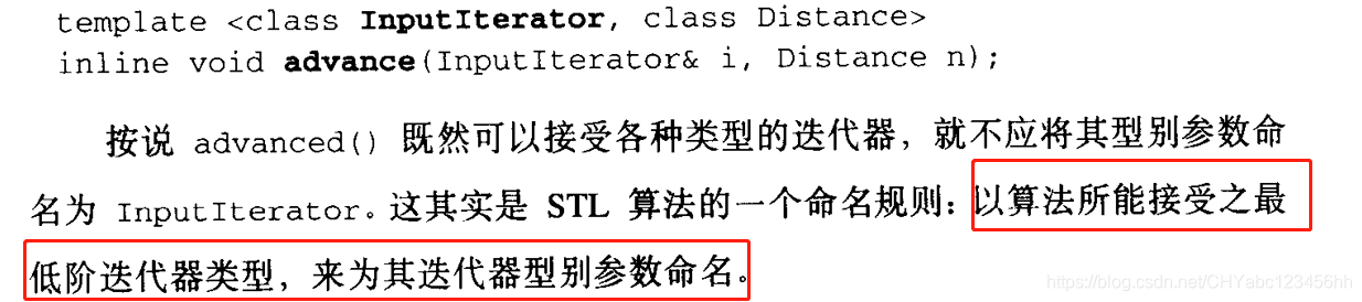 - 按 说 advanced()既然可以接受各种类型的迭代器,就不应将其型别参数命 名为Inputiterator。这其实是STL算法的一个命名规则:以算法所能接受之最 低阶迭代器类型,来为其迭代器型别参数命名。