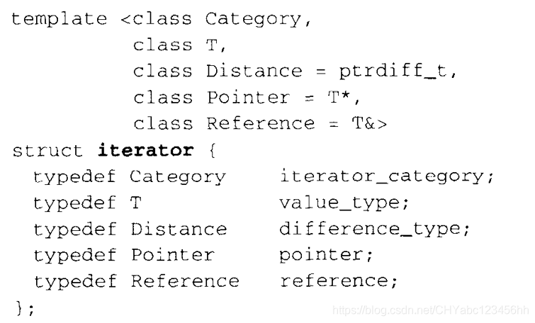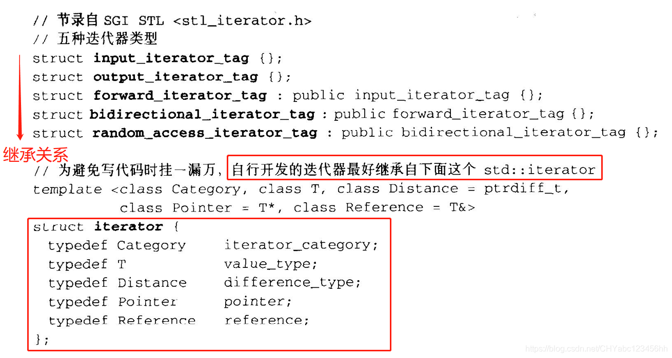 - 了符合规范,任何迭代器都应该提供五个内嵌相应型别,以利于traits萃取,否则便是自别于整个STL架构,可能无法与其它STL组件顺利搭配。然而写代码难免挂一漏万,谁也不能保证不会有粗心大意的时候。如果能够将事情简化,就好多了。STL提供了一个iterators class如下,如果每个新设计的迭代器都 继承自它,就可保证符合STL所需之规范: