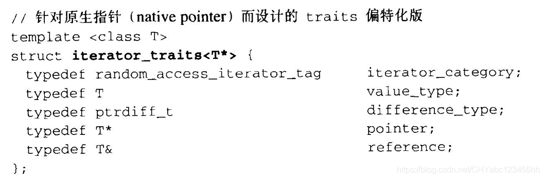 - 针对相应型别difference type, traits的如下两个(针对原生指针而写的)特 化版本,以 C++内建的ptrdiff_t (定义于<cstddef>头文件)作为原生指针的 difference type:
