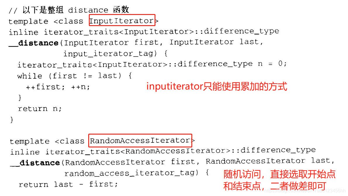 - distance使用 category动态适配 InputIterator和randomAccessiterator,分别调用与之匹配的__distance函数,但是这个 distance使用的时候 <> 需要指定最小的迭代器类型,来为迭代器进行命名