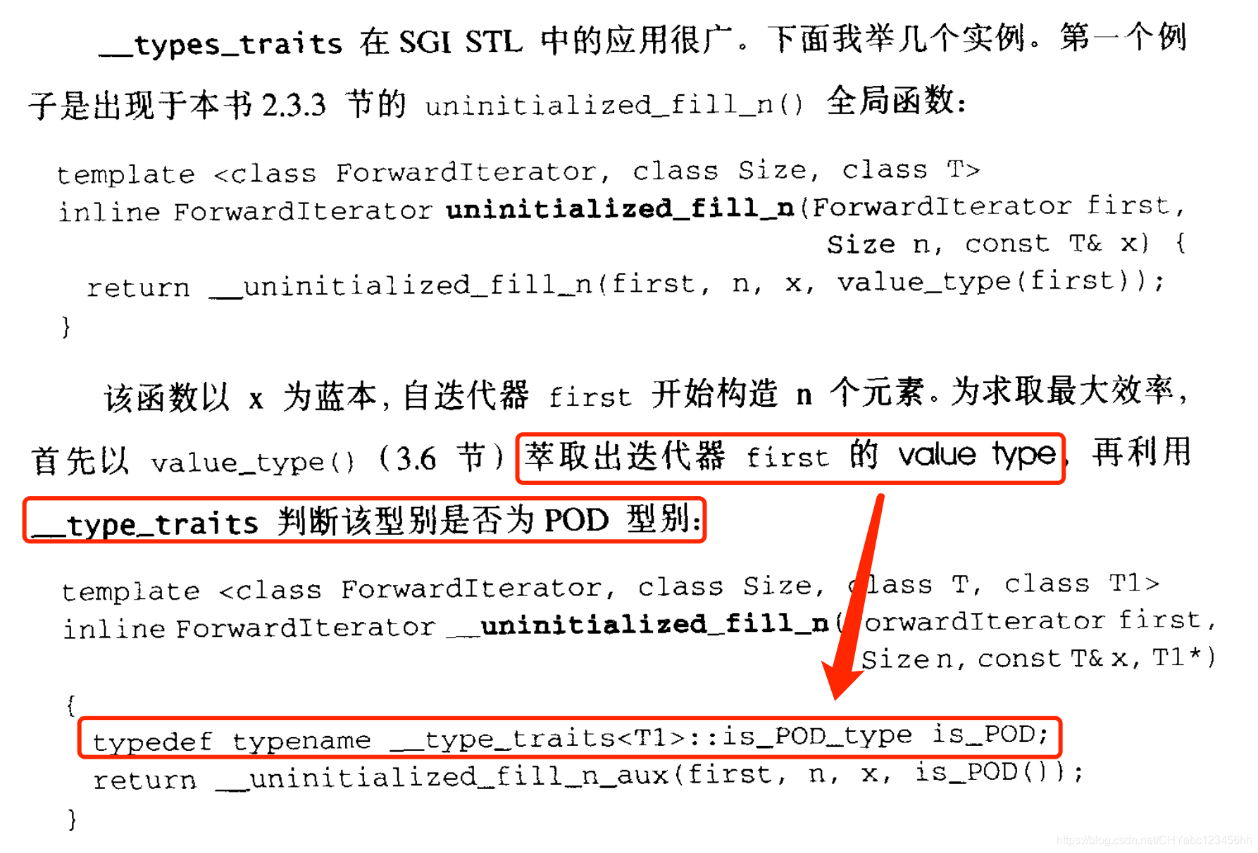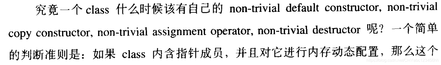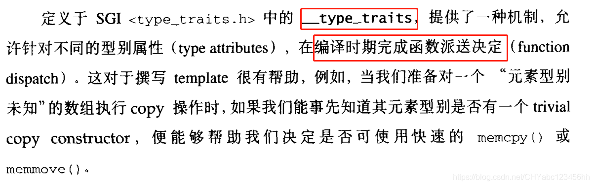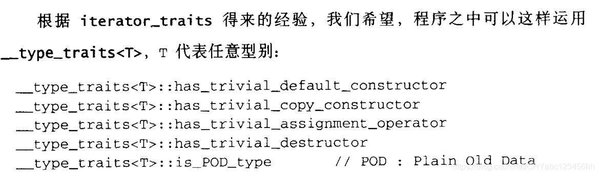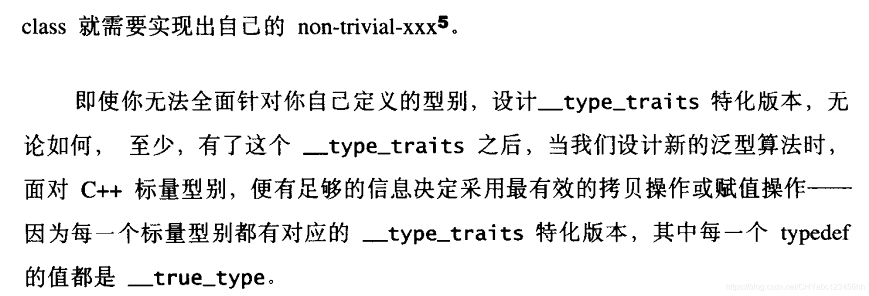 - 此处我们所关注的型别特性是指:这个型别是否具备non-trivial defaltctor ? 是否具备 non-trivial copy ctor ? 是否具备 non-trivial assignment operator?是否具备non-trivial dtor?如果答案是否定的,我们在对这个型别进行构造、析构、拷贝、赋值等操作时,就可以采用最有效率的措施(例如根本不调用身居高位,不谋实事的那些constructor, destructor), 而采用内存直接处理操作如 malloc. memcpy等等,获得最高效率。这对于大规模而操作频繁的容器, 有着显著的效率提升4。