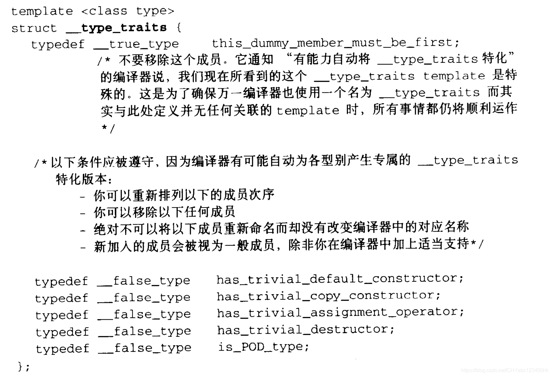 - 为了达成上述五个式子,— type_traits内必须定义一些typedefs,其值不是 _ true_type 就是 _ false_type下面是 SGI 的做法: