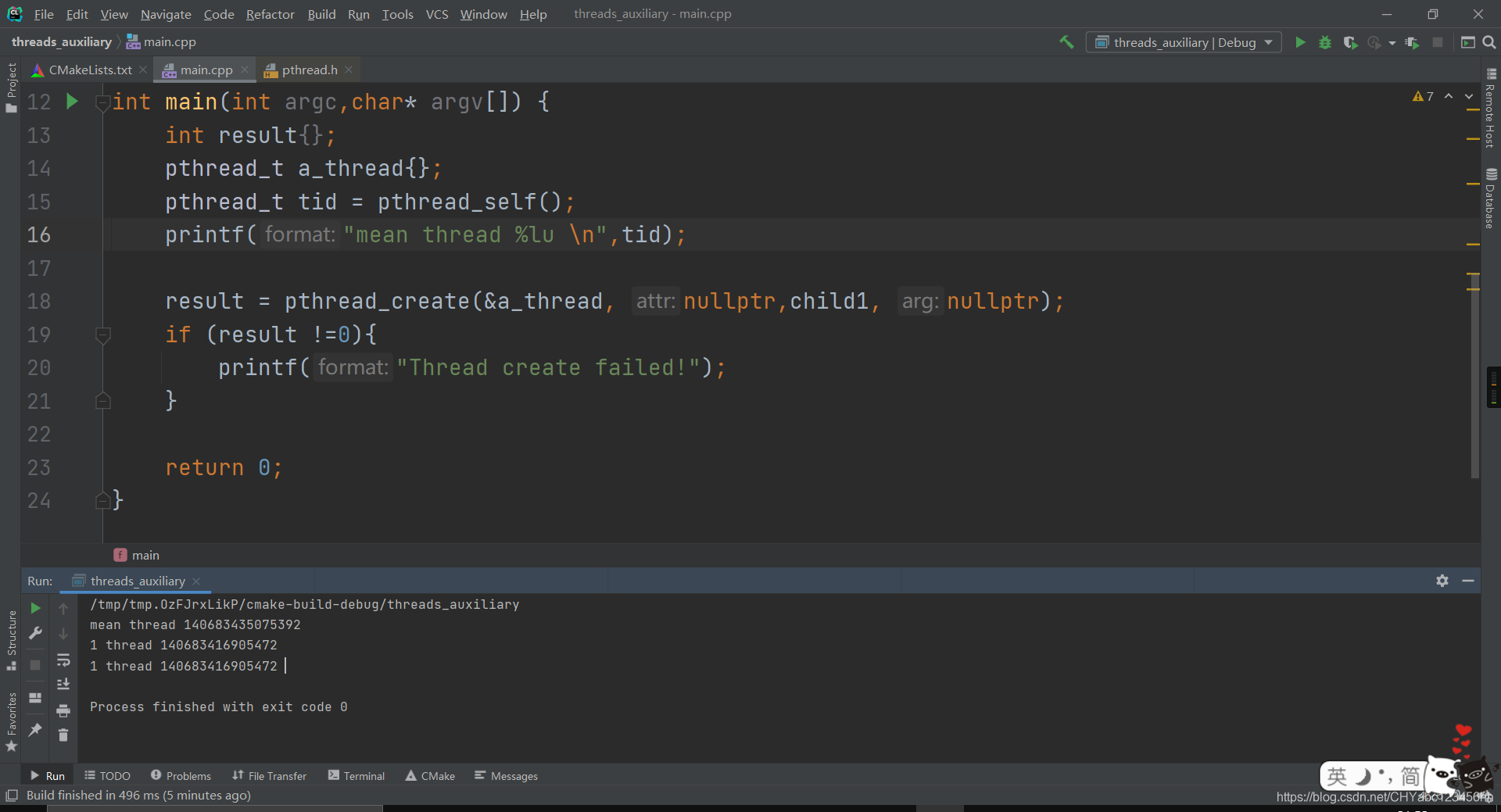 #include <pthread.h>void * child1(void *arg){pthread_t tid = pthread_self();printf("1 thread %lu \n",tid);}int main(int argc,char* argv[]) {int result{};pthread_t a_thread{};pthread_t tid = pthread_self();printf("mean thread %lu \n",tid);result = pthread_create(&a_thread, nullptr,child1, nullptr);if (result !=0){printf("Thread create failed!");}return 0;
