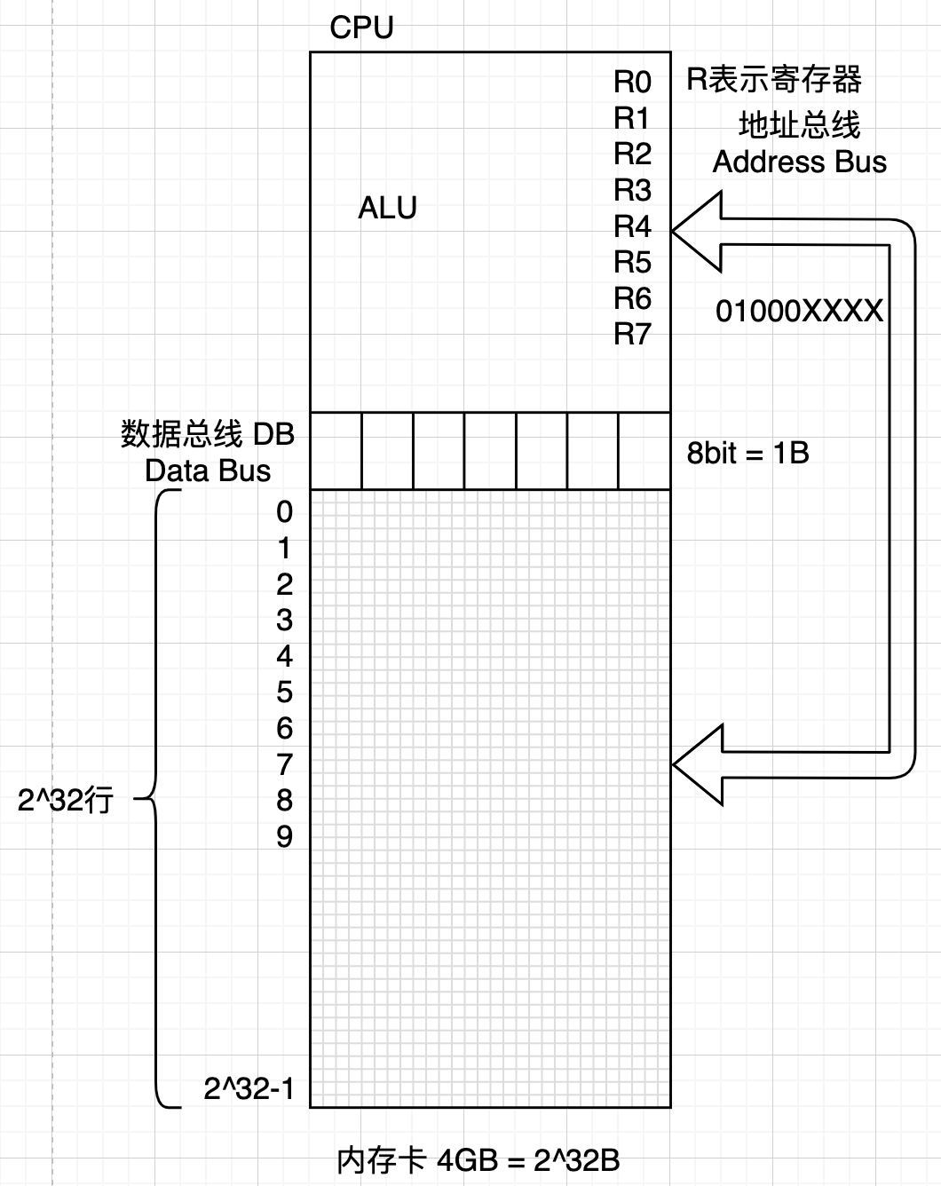 - DB(Data bus)数据总线: 8根数据线组成数据总线,确定了每一列,通过行和列将1B数据数据通过数据总线传输到cpu内部的寄存器里面,使用R表示寄存器