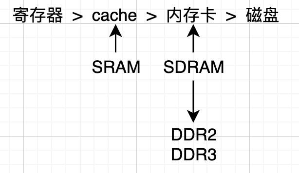 - 寄存器 (cpu内部)> cache(cpu内部) > 内存卡 (cpu外部)> 磁盘(cpu外部)