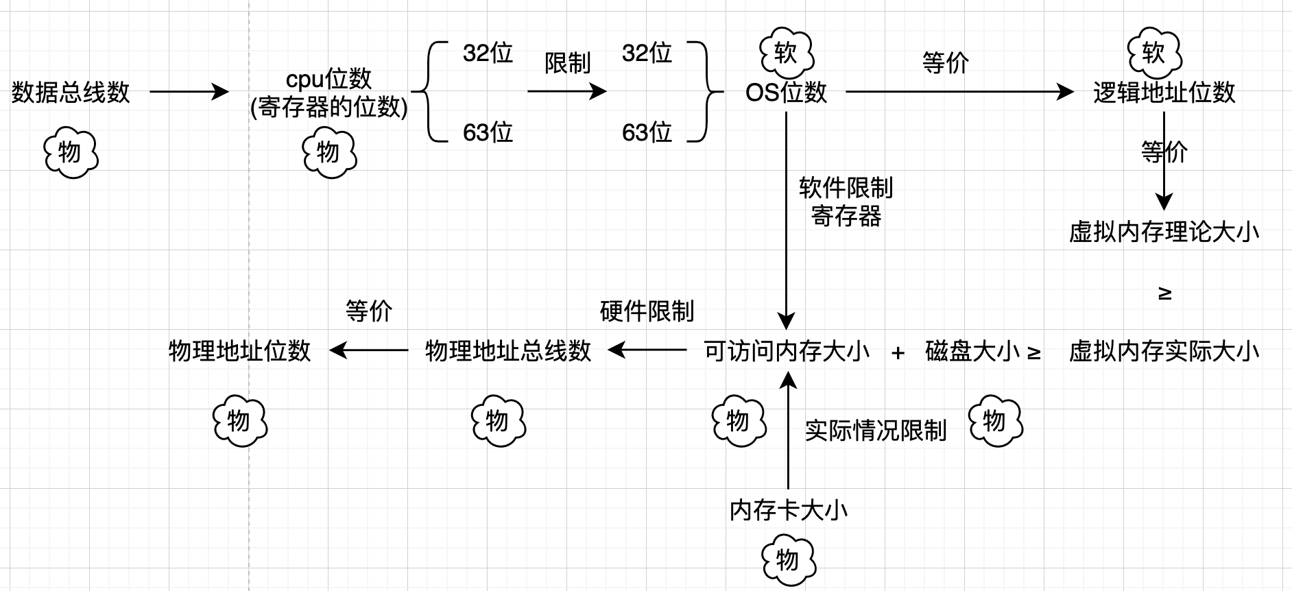 - os位数(操作系统的位数):硬件限制软件;软件可以自定义(软件分成32位或者64位);os位数等价于逻辑地址的位数,二者相等。也等价于虚拟内存的理论大小。