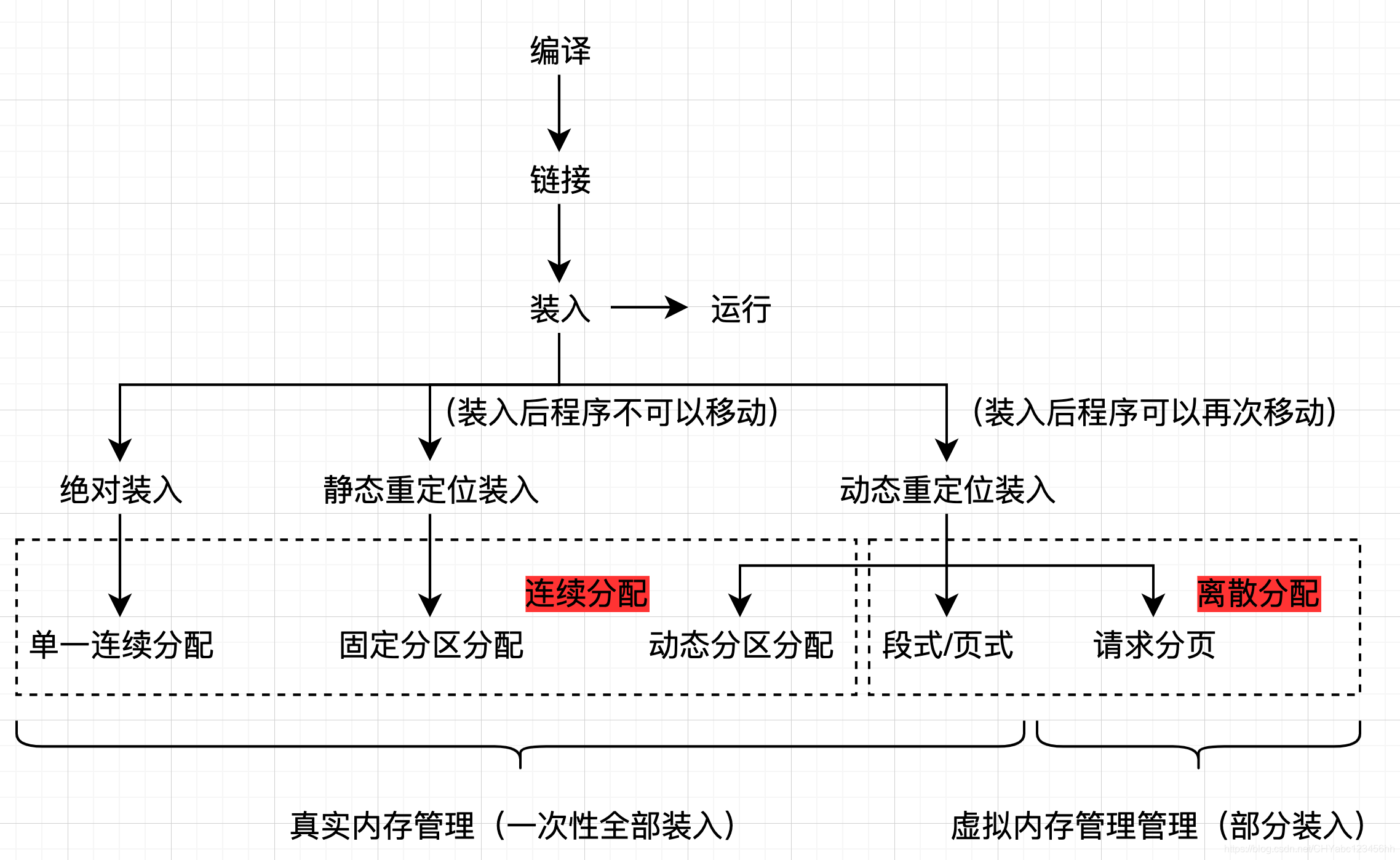 - 解决方案 :1,绝对装入;2,静态重定位装入;3,动态重定位装入