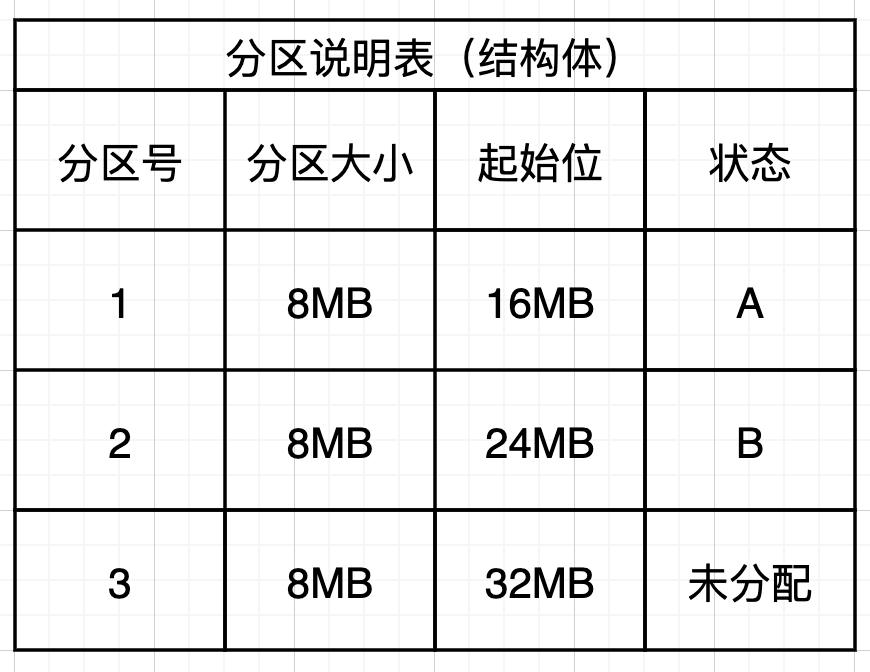 - 需要分区说明表 记录分区号 分区的大小 起始位置 状态