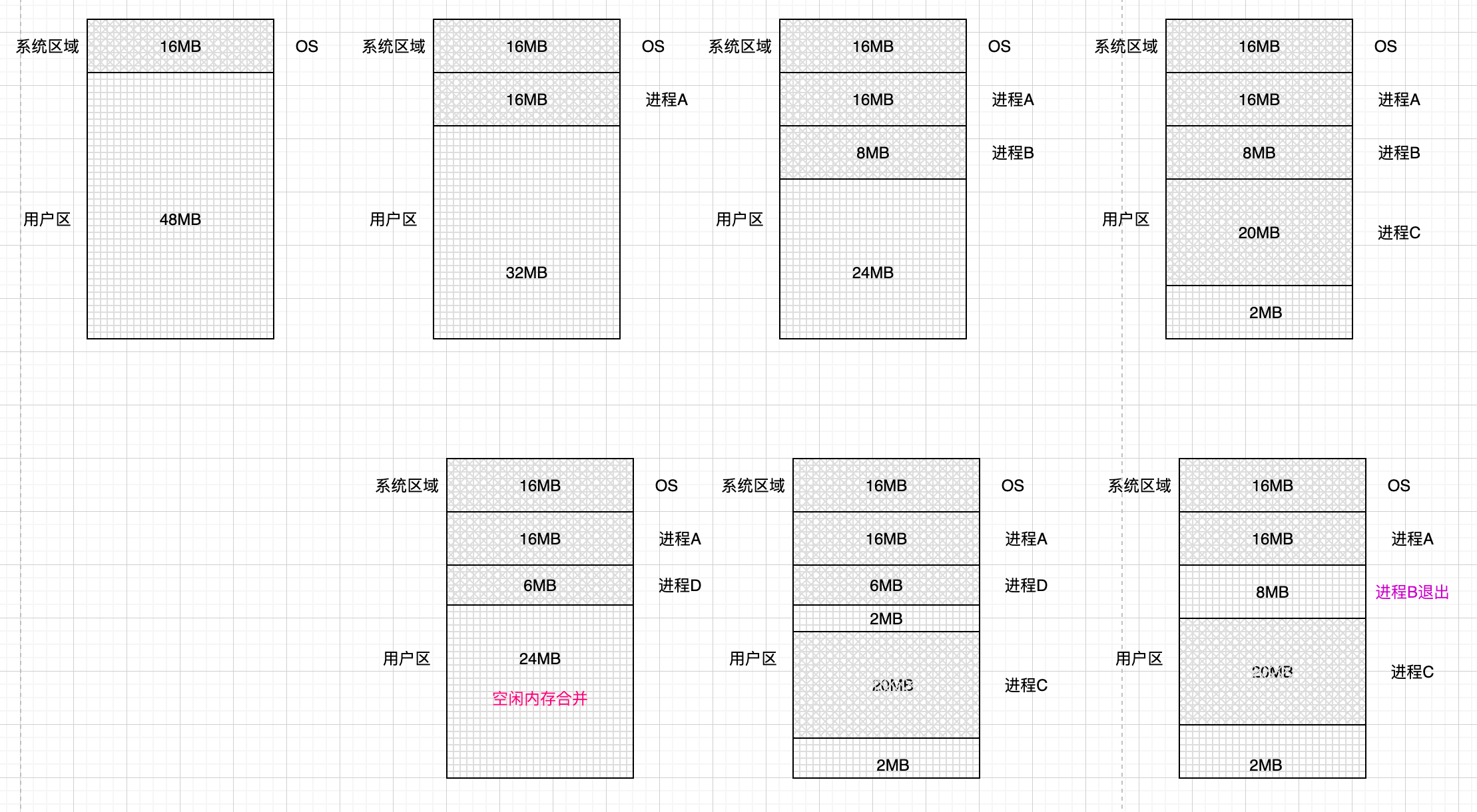 - 克服单一连续分配只可以装入一个程序的缺点,在用户区进行划分,每个区块分配不同的程序