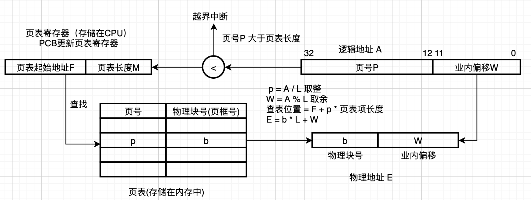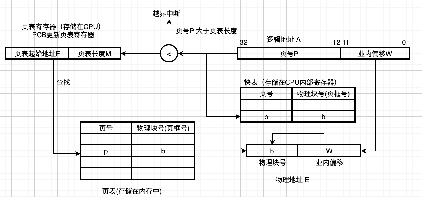 - 页号p 业内偏移w : 分页的逻辑结构 -> 查询页表 得到物理地址 物理块号b b|w