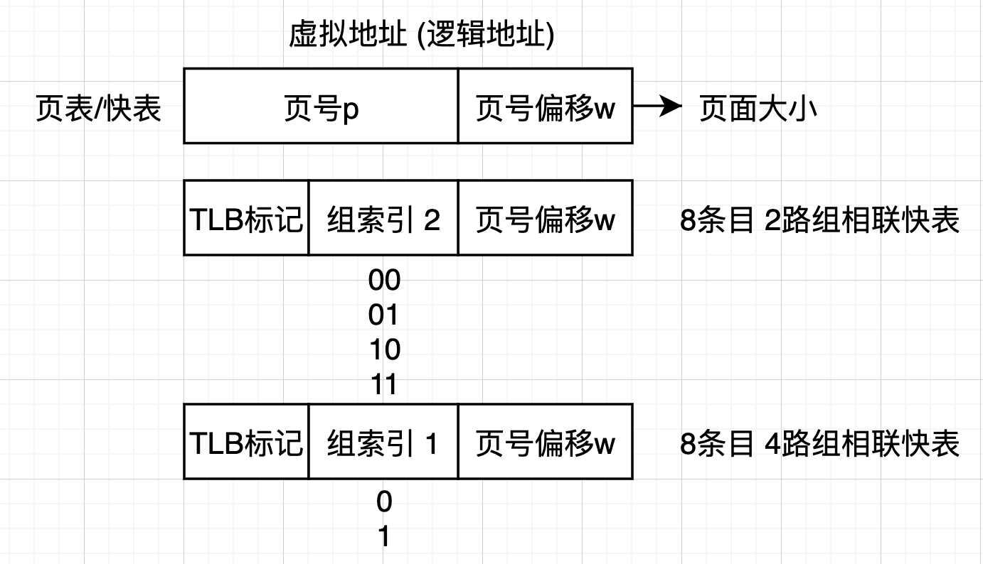 - 虚拟地址(逻辑地址结构):将先前全相联映射中的页号p化为TLB标记和组索引、业内偏移w不变;