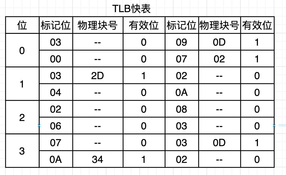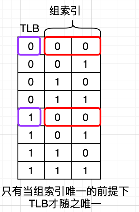 - 如果是8条目2路组相联,分成四组,将页号的后两位(00,01,10,11表示组号)作为组索引,剩余的作为TLB,在组索引唯一的条件下,TLB是唯一的标识