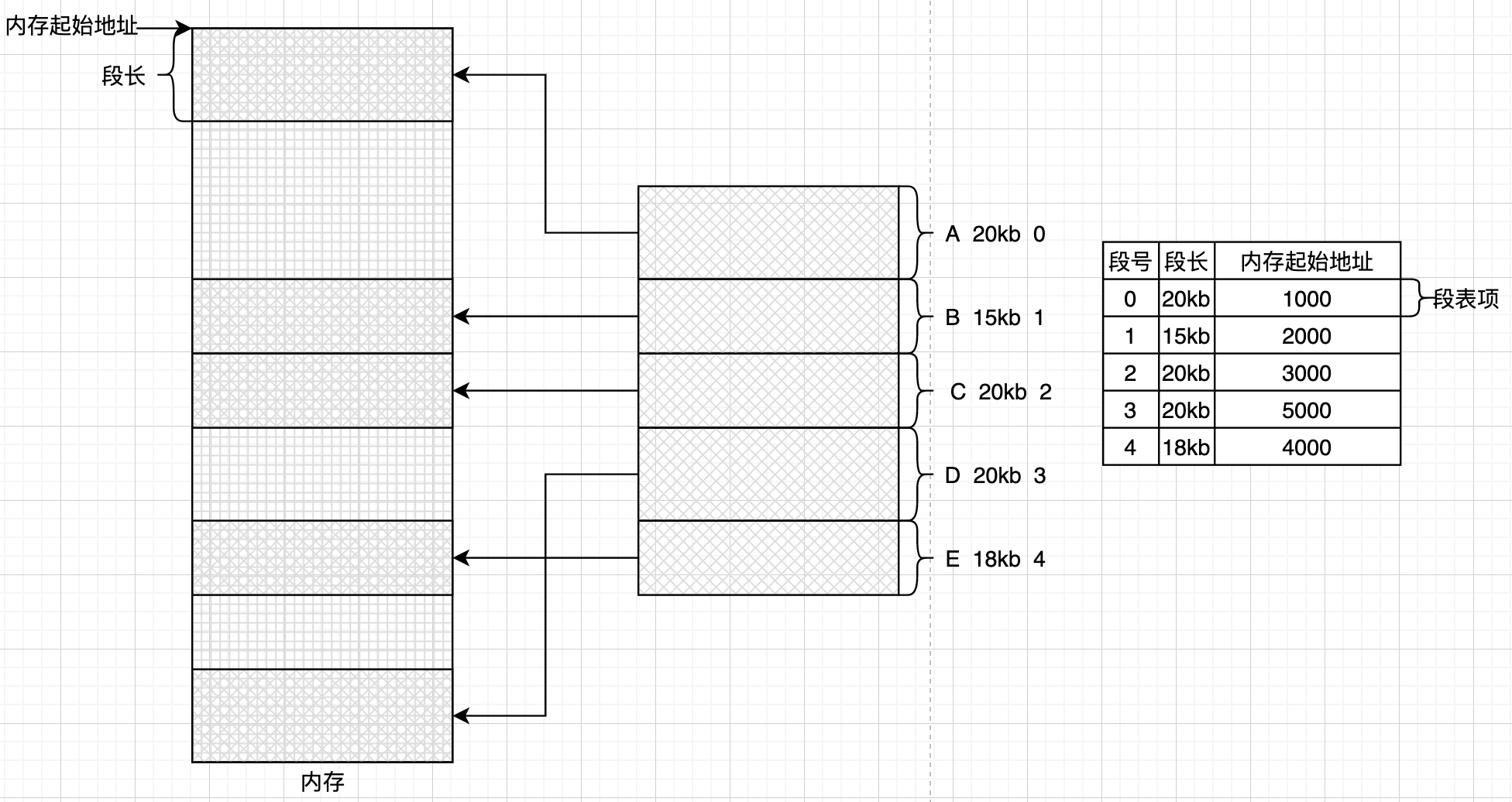 - 分页有页表,记录程序转入到内存的位置,那么分段也应该有段表,功能一致,记录