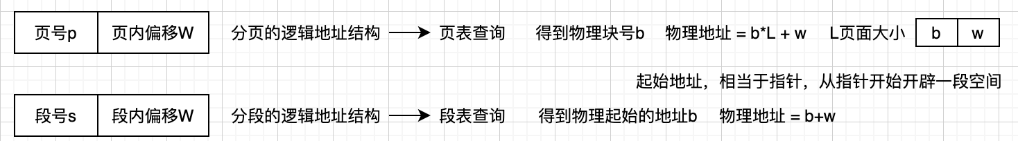 - 段号s 段内偏移w : 分段的逻辑结构 -> 查询段表 得到物理地址 物理块号b b+w