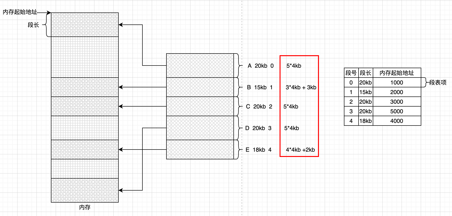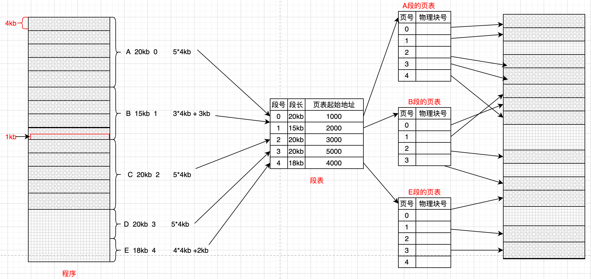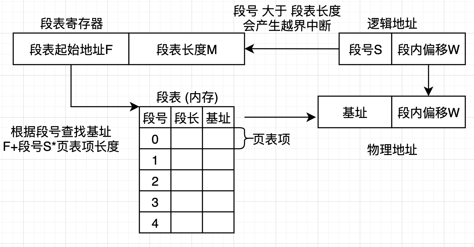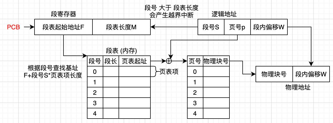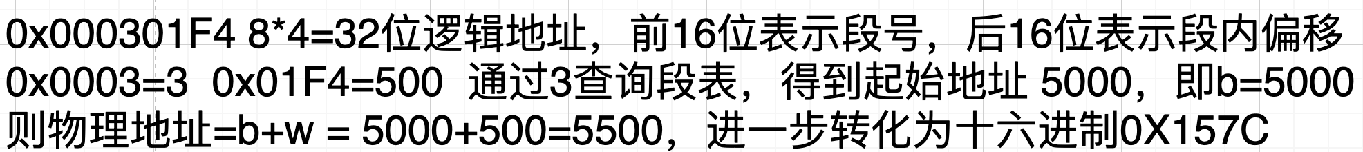 - 3,通过 E=b+w 段表项地址 + 段内偏移 = 物理地址