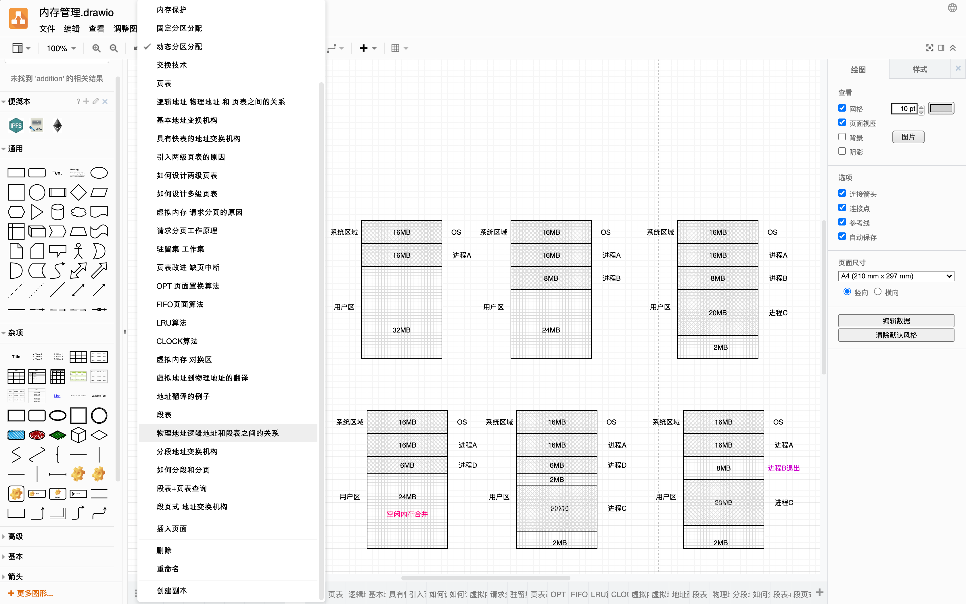 - 段页式存储管理:先将程序按照自然段进行分段,再将每个自然段切成等大的页。从而汇聚两者的优势