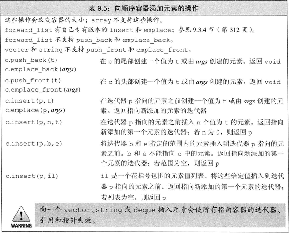 - 除array外,所有标准库容器都提供灵活的内存管理。在运行时可以动态添加或删除元素来改变容器大小。表9.5列出了向顺序容器(非array)添加元素的操作。