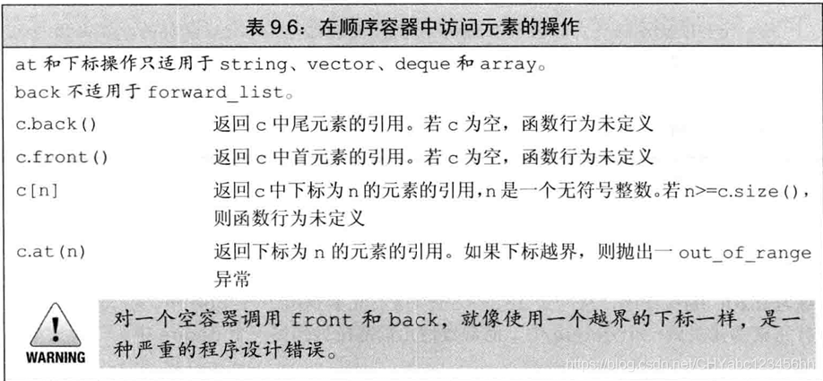 - 表9.6列出了我们可以用来在顺序容器中访问元素的操作。如果容器中没有元素,访问操作的结果是未定义的。包括array在内的每个顺序容器都有一个front成员函数,而除forward_list