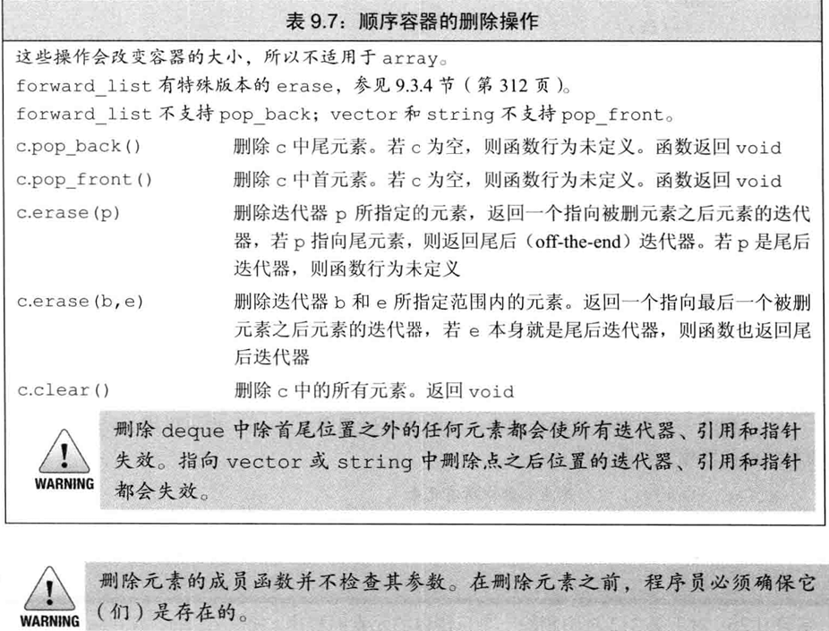 - 与添加元素的多种方式类似,(非array)容器也有多种删除元素的方式。表9.7列出了这些成员函数