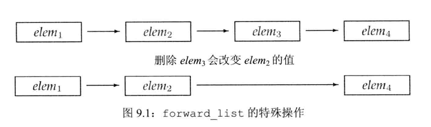 - 为了理解forward_list为什么有特殊版本的添加和删除操作,考虑当我们从一个单向链表中删除一个元素时会发生什么。如图9.1所示,删除一个元素会改变序列中的链接。