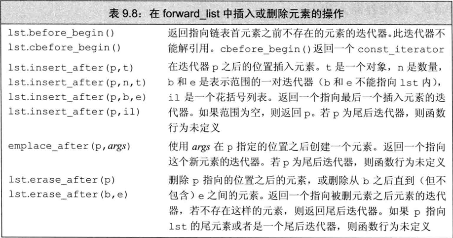 - 由于这些操作与其他容器上的操作的实现方式不同,forward_list并未定义insert、emplace和erase,而是定义了名为insert_after、emplace_after和erase_after的操作(参见表9.8)。例如,在我们的例子中,为了删除elem3,应该用指向elem2的迭代器调用erase_after。为了支持这些操作,forward_list也定义了before_begin,它返回一个首前(off-the-beginning)迭代器。这个迭代器允许我们在链表首元素之前并不存在的元素"之后”添加或删除元素(亦即在链表首元素之前添加删除元素)。