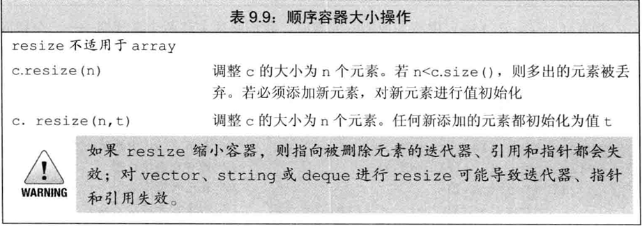 - 如表9.9所描述,我们可以用resize来增大或缩小容器,与往常一样,array不支持resize。如果当前大小大于所要求的大小,容器后部的元素会被删除;如果当前大小小于新大小,会将新元素添加到容器后部: