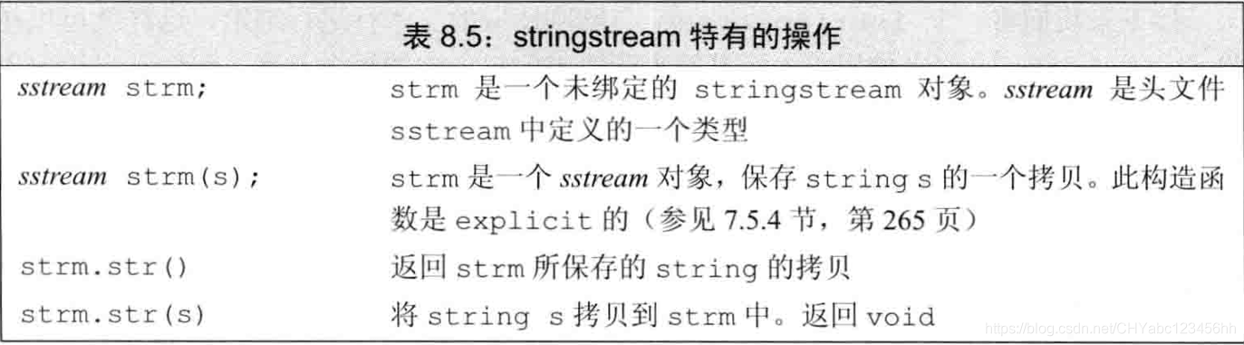 - istringstream从string读取数据,ostringstream向string写入数据,而头文件stringstream既可从string读数据也可向string写数据。与fstream类型类似,头文件sstream中定义的类型都继承自我们已经使用过的iostream头文件定义的类型。除了继承得来的操作,sstream中定义的类型还增加了一些成员来管理与流相关联的stringo表8.5列出了这些操作,可以对stringstream对象调用这些操作,但不能对其他IO类型调用这些操作。