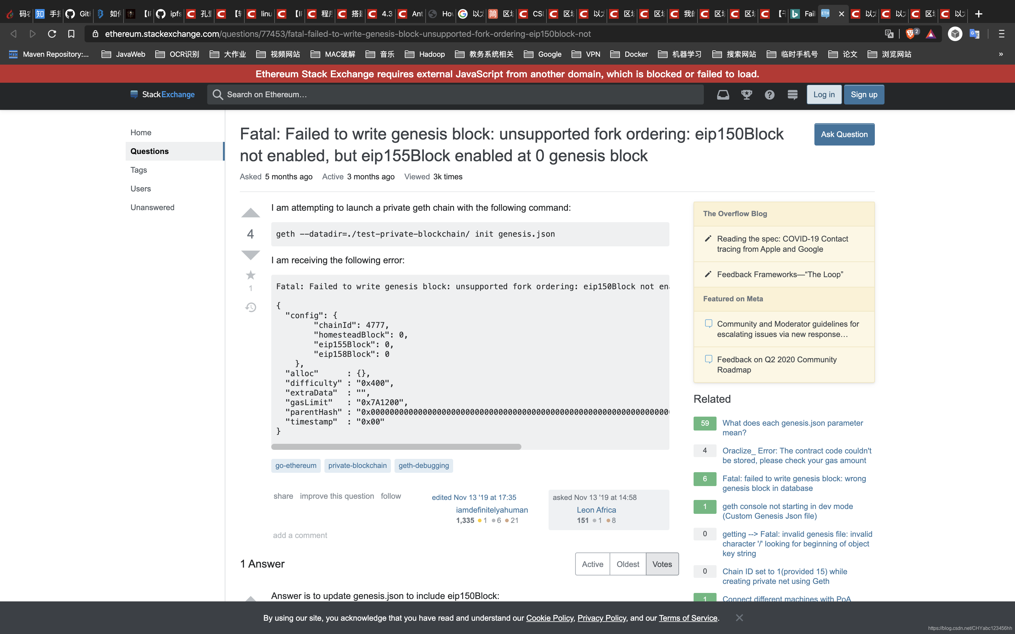- 注意事项,我参考好多文章都缺失eip150Block:0这一句,这会出现错误。