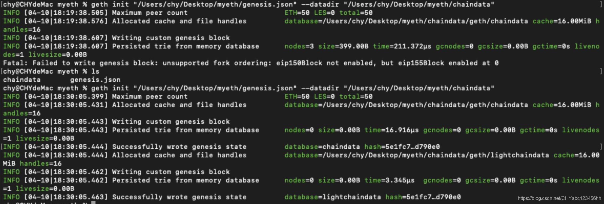 geth init "/Users/chy/Desktop/myeth/genesis.json" --datadir "/Users/chy/Desktop/myeth/chaindata"