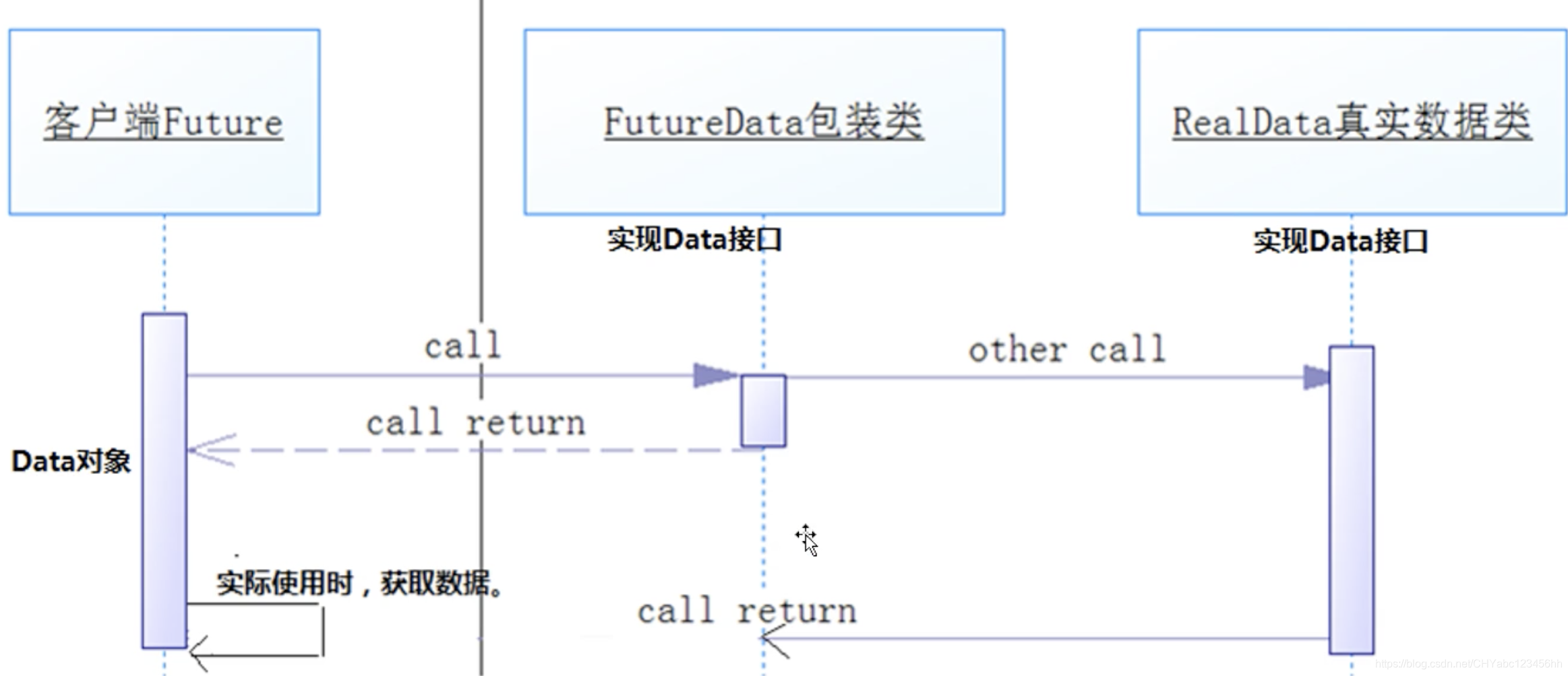 - 最为关键的就是FutureData包装类,当客户端发出请求,FutureData会接收并返回请求,但是此时这个call return并不包含真是的数据,FutureData会发送other call去获取真实的数据类,再将真实的数据类返回,用于真正的实际使用。