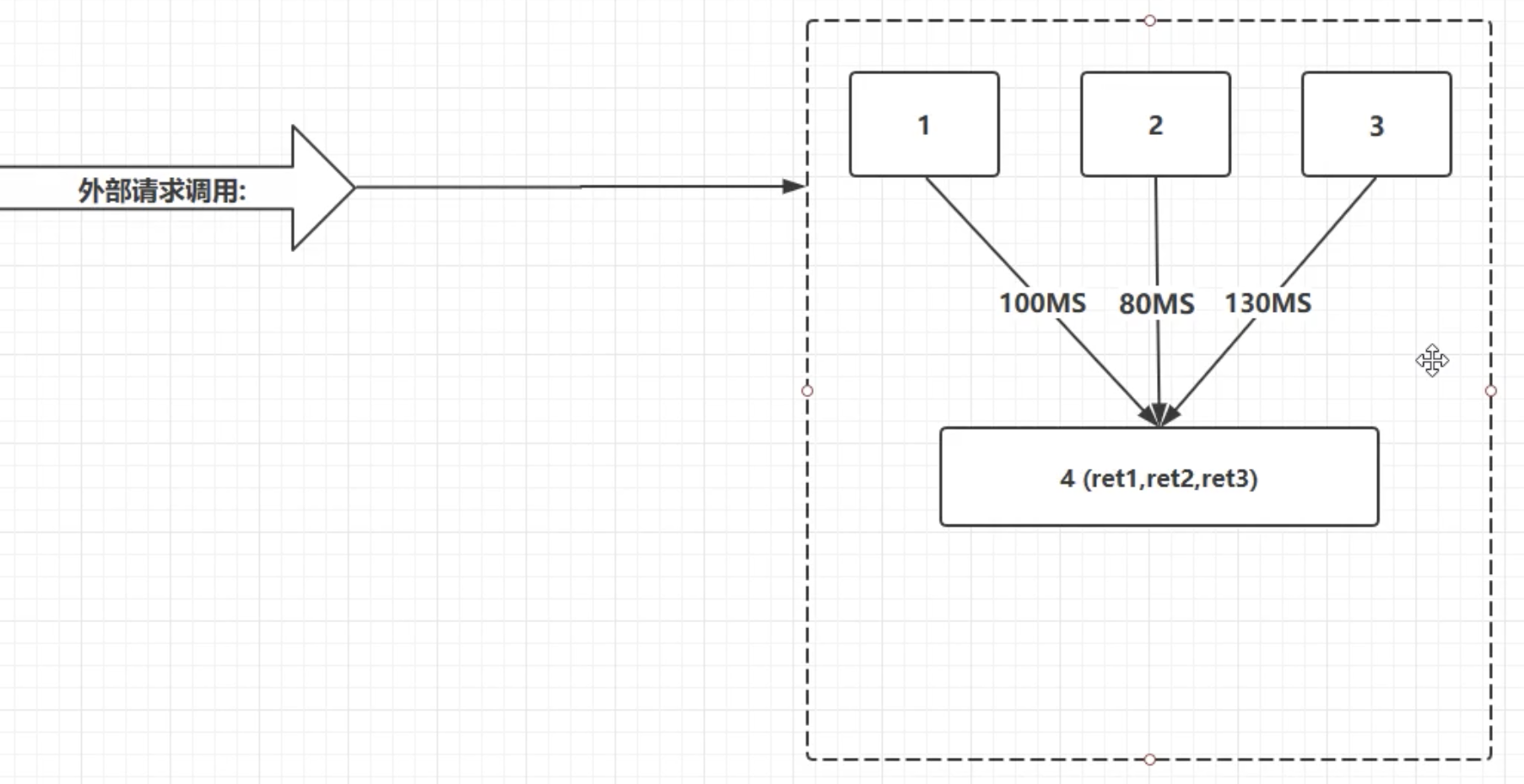 - 适用于如下情况,外部请求调用的函数由四部分组成,分别是1、2、3和4,第4部分需要1、2和3的结果作为输入值,并且他们将数据传给4的时间是不同的,所以4需要等待最慢的结果(短板效应),因此,最慢的也是我们今后的突破口