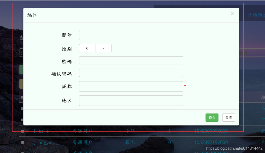 <buttontype="button"class="update-button"style="width:70px; height:40px;"data-toggle="modal"data-target=".update-Dialog"> 编辑</button><div class="modal fade update-Dialog">...</div>