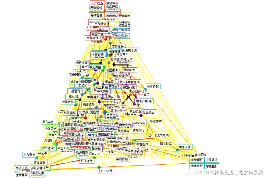 # 为了将上述聚类分析进行可视化,需要在一个2D画布上布置不同的股票。为此,需要使用“流形”技术来检索二维嵌入。模型的输出组合成一个二维图,其中节点代表股票名称,边表示: