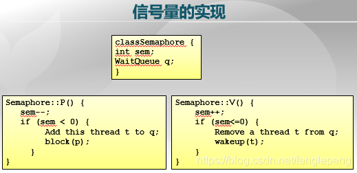 - P(): sem–,如果sem<0,等待,否则继续,类似lock_acquire