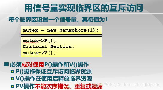 - 信号量是被保护的整数变量。初始化完成后,只能通过P()V()操作修改;由操作系统保证,PV操作时原子操作。