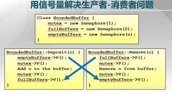 如下图是利用信号量实现的生产者消费者模型。生产者消费者模型的要求是同一时刻只能有一个生产者或消费者访问缓冲区,生产者只能在缓冲区有空间时才能往里塞数据,消费者只有缓冲区有数据时才能从里面消费数据。