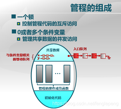 管程与临界区结构上差别在于多了共享数据,共享数据作为条件变量,如果条件变量的数量为0则跟临界区完全一样。进入管程的线程因资源被占用而进入等待状态,每个条件变量表示一种等待原因,对应着一个等待队列。管程最重要的两个操作:wait()和Signal(),wait将自身阻塞在等待队列中,唤醒一个等待者或释放管程的互斥访问,Signal操作将等待队列中的一个线程唤醒,如果等待队列为空,则等同空操作。