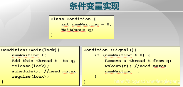 - wait() 操作:将自己阻塞在等待队列中,唤醒一个等待者或释放管程的互斥访问;