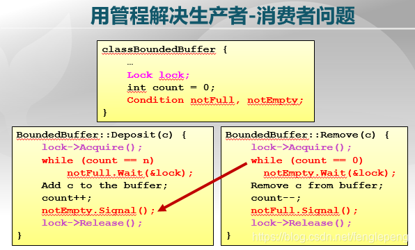 先在前后加锁,因为要保证只有一个线程在临界区 lock在等待/睡眠的时候通过;lock->Acquire()管程进入和lock->Release()管程释放;notfull.wait(&lock)释放锁。唤醒后获得锁。
