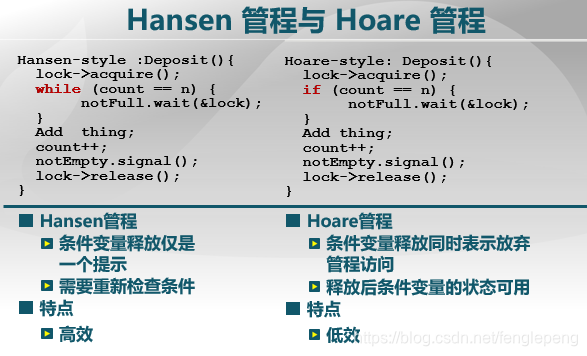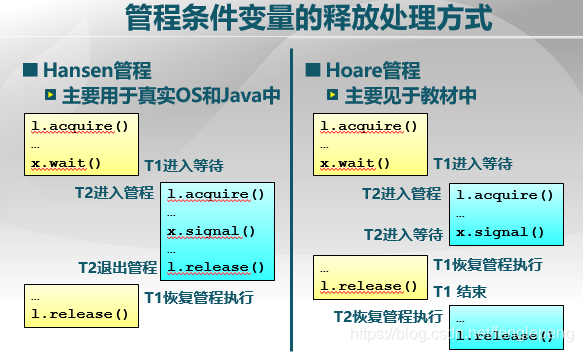 管程条件变量释放处理方式有两种如下图。可以看到Hoare的管程方式是更符合实际使用效果的,但是Hansen管程实现方式少了一次进程上下文切换,因此真实OS中一般使用Hansen管程方式。