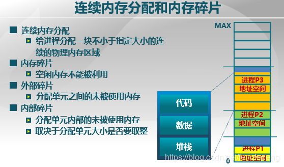 - 连续内存分配:给进程分配一块不小于指定大小的连续的物理内存区域。