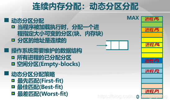 在没有其他方式辅助的情况下,我们分配给一个进程的内存是连续的。在分配时候我们需要有动态分配与碎片处理。如何理解呢?就是每个进程需要一块内存,我们要选取合适的位置的内存分配给它。当有的进程先结束了内存还给操作系统,此时可能就会产生内存碎片,要对碎片进行处理。首先对一些概念进行解释。