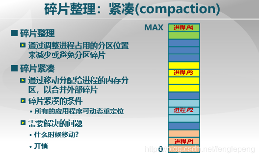 系统运行过程中,碎片越来越多,很可能无法获取需要的较大的内存空间。我们需要解决这个问题,这就是碎片整理的意义,可以通过碎片整理获得更大的连续内存空间,以便于满足进程的应用空间需求。碎片整理是通过调整进程占用的分区位置来减少或避免分区碎片的。碎片整理有很多种方式,比如碎片紧凑、分区对换。