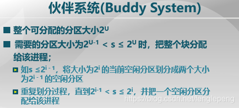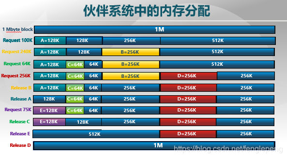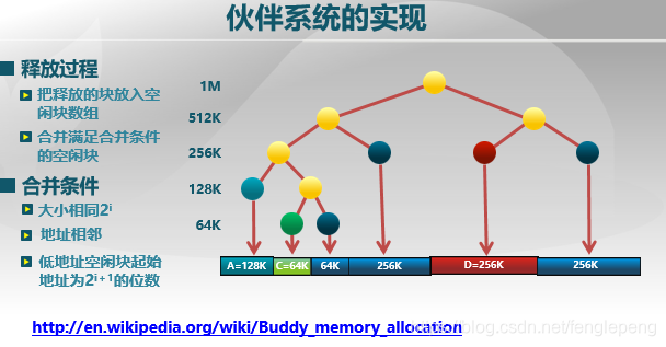 伙伴系统是连续存储分配的一种办法。它比较好地折中了分配和回收过程中分配块的位置碎片和合并的问题。伙伴系统地概念如下图:整个可分配分区大小为2的幂次方,当需要的内存空间大于当前块的一半的时候就将整个分区分配给进程,如果小于当前分区的一半,就将当前分区对半分开,将其中一半继续与需要的内存大小进行比较,递归进行下去,直到满足所需内存大小大于分区一半。可以看到这种分配方式内部碎片最大为分区大小的一半减一。知道了伙伴系统的思想,下面我们看下具体实现。