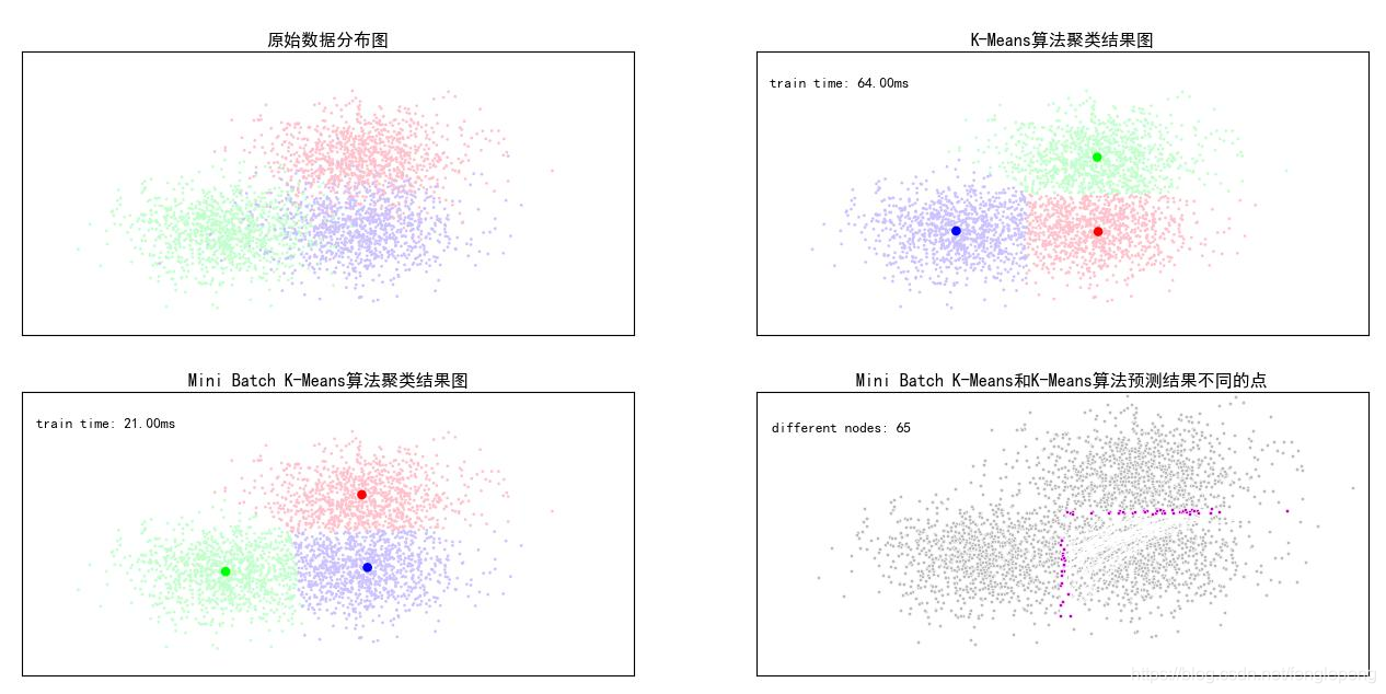 Mini Batch K-Means算法是K-Means算法的一种优化变种,采用小规模的数据子集(每次训练使用的数据集是在训练算法的时候随机抽取的数据子集)减少计算时间,同时试图优化目标函数;Mini Batch K-Means算法可以减少K-Means算法的收敛时间,而且产生的结果效果只是略差于标准K-Means算法
