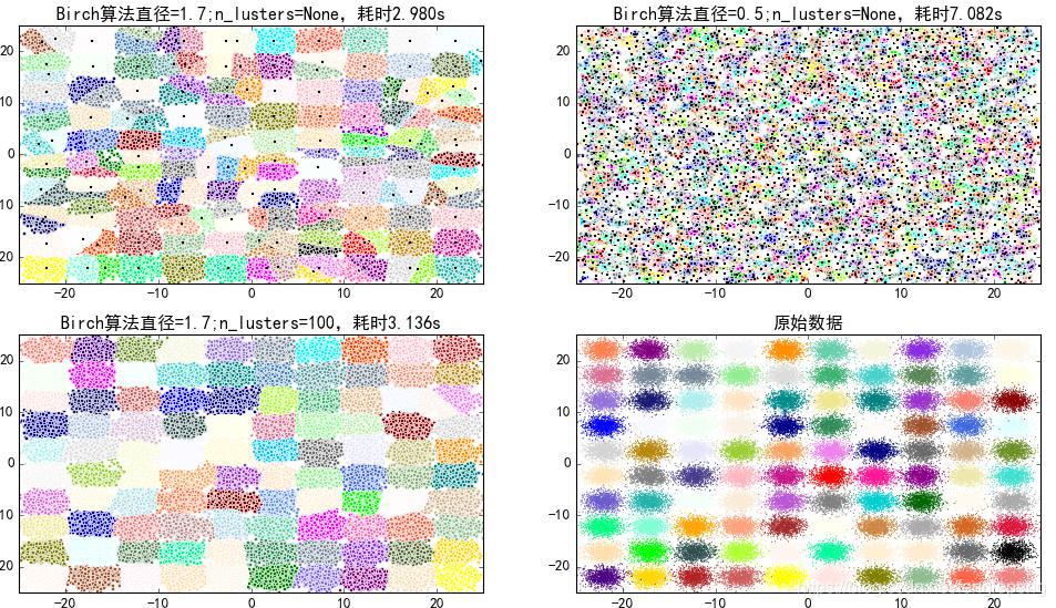 BIRCH算法(平衡迭代削减聚类法)(重要):聚类特征使用3元组进行一个簇的相关信息,通过构建满足分枝因子和簇直径限制的聚类特征树来求聚类,聚类特征树其实是一个具有两个参数分枝因子和类直径的高度平衡树;分枝因子规定了树的每个节点的子女的最多个数,而类直径体现了对这一类点的距离范围;非叶子节点为它子女的最大特征值;聚类特征树的构建可以是动态过程的,可以随时根据数据对模型进行更新操作。