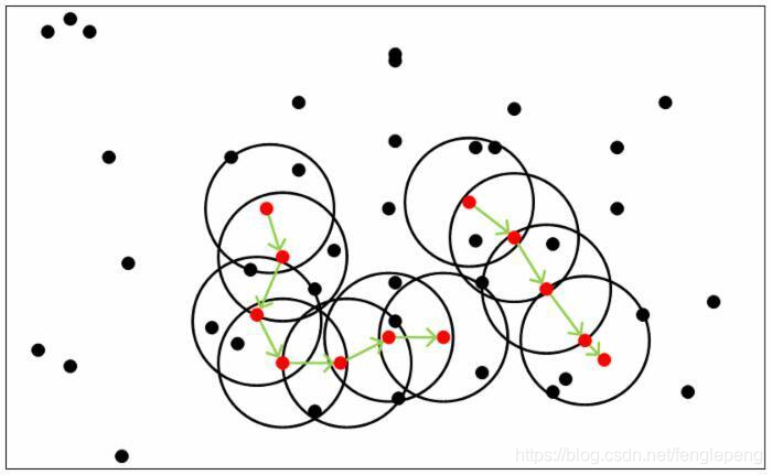 密度聚类方法的指导思想: 只要样本点的密度大于某个阈值,则将该样本添加到最近的簇中。
